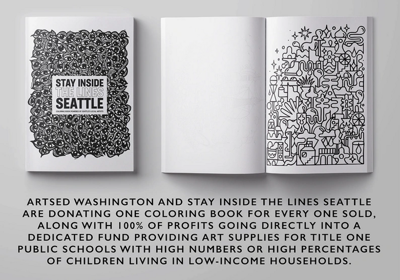 We joined forces with ArtsEd Washington in 2021 at the on-set of COVID to establish 'Color for the Arts' a new art supplies fund for Title 1 schools in Washington state with high numbers or high percentages of children living in low-income households. Together we produced physical coloring books of our collection of pages which we donated one coloring book for each book sold, along with 100% of profits from the book to these Title 1 schools and surrounding communities.